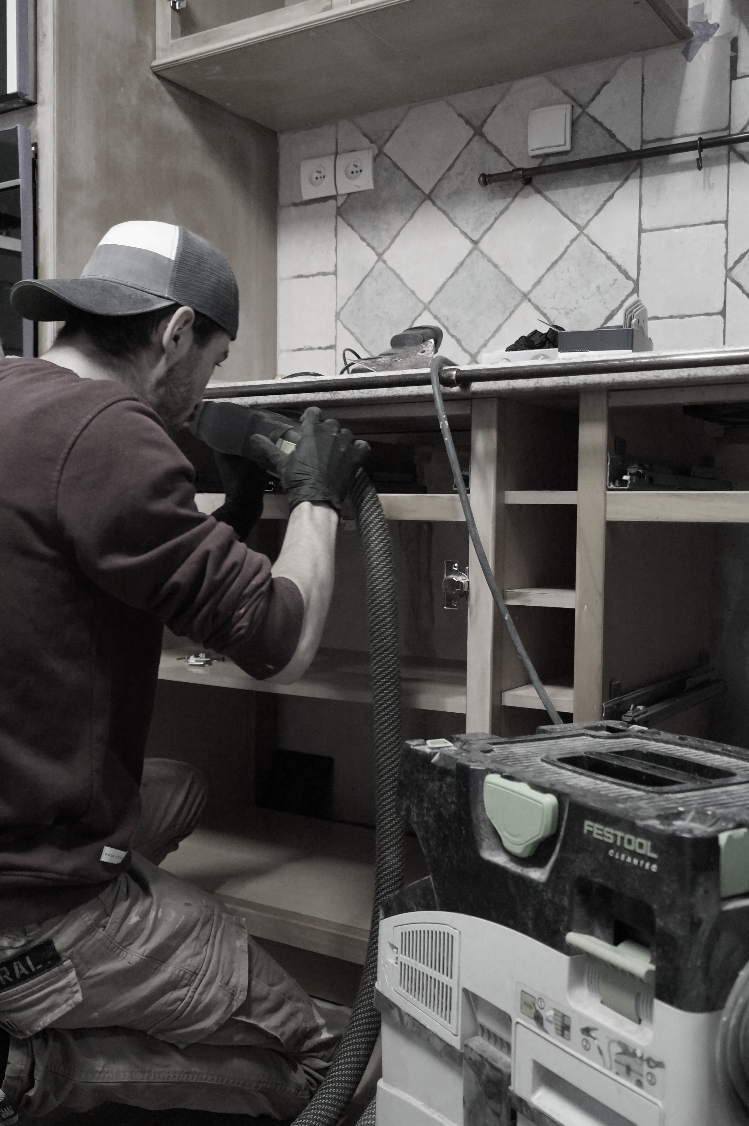 Nous rénovons les façades de cuisine à l’atelier dans notre cabine de peinture en appliquant au pistolet nos peintures professionnelles pour un rendu lisse, sans traces et résistant au quotidien.